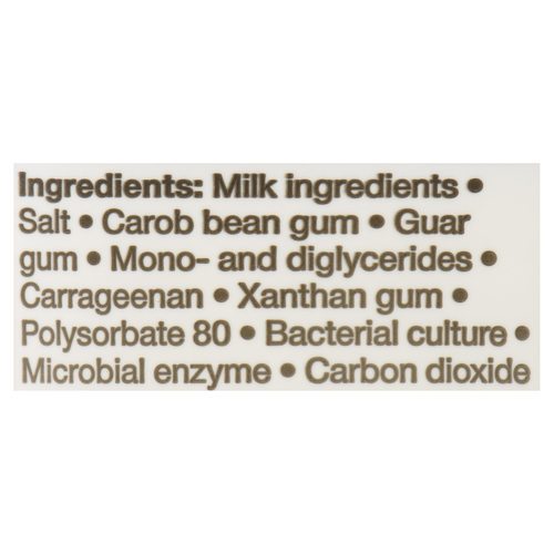 Milk ingredients, Salt, Carob bean gum, Guar gum, Mono- and diglycerides, Carrageenan, Xanthan gum, Polysorbate 80, Bacterial culture, Microbial enzyme, Carbon dioxide